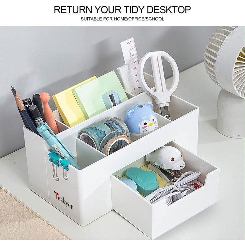 Make Everything in Order: this desk organizer has 7 compartments and a big drawer. Various sized compartments let you easily storage different shaped office/school supplies, such as pens, pencils, scissors, tapes, clips, sticky notes etc
